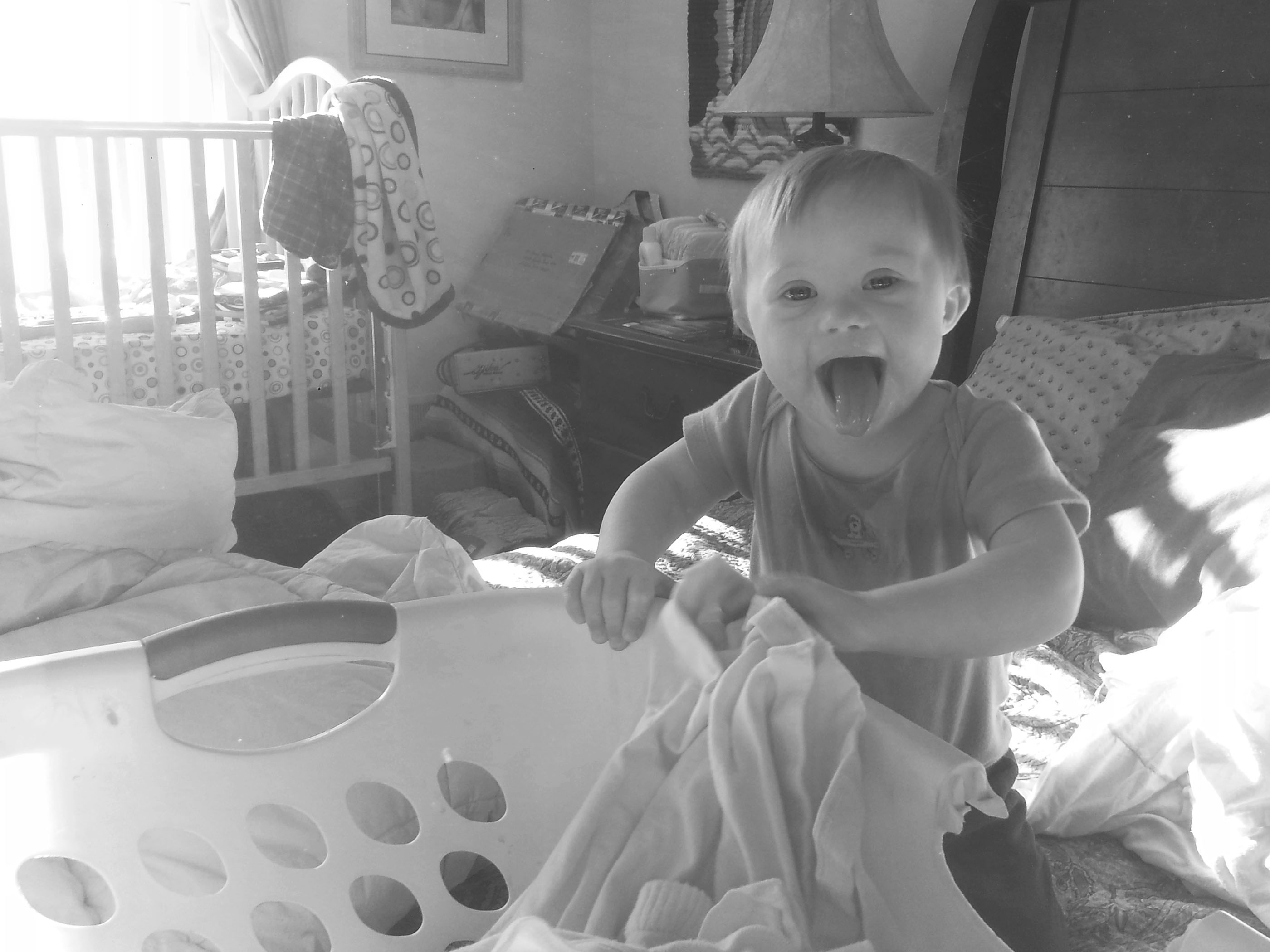 He looks very happy to be helping! It looks like a nice, sunny room.